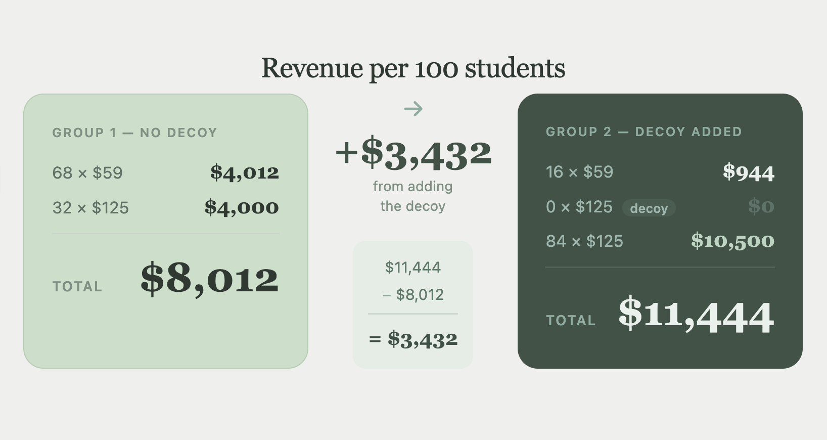 The trick in decoy pricing is to construct an option that is clearly inferior on a value-per-dollar basis compared to your preferred choice, thus making that choice obvious for a rational buyer.